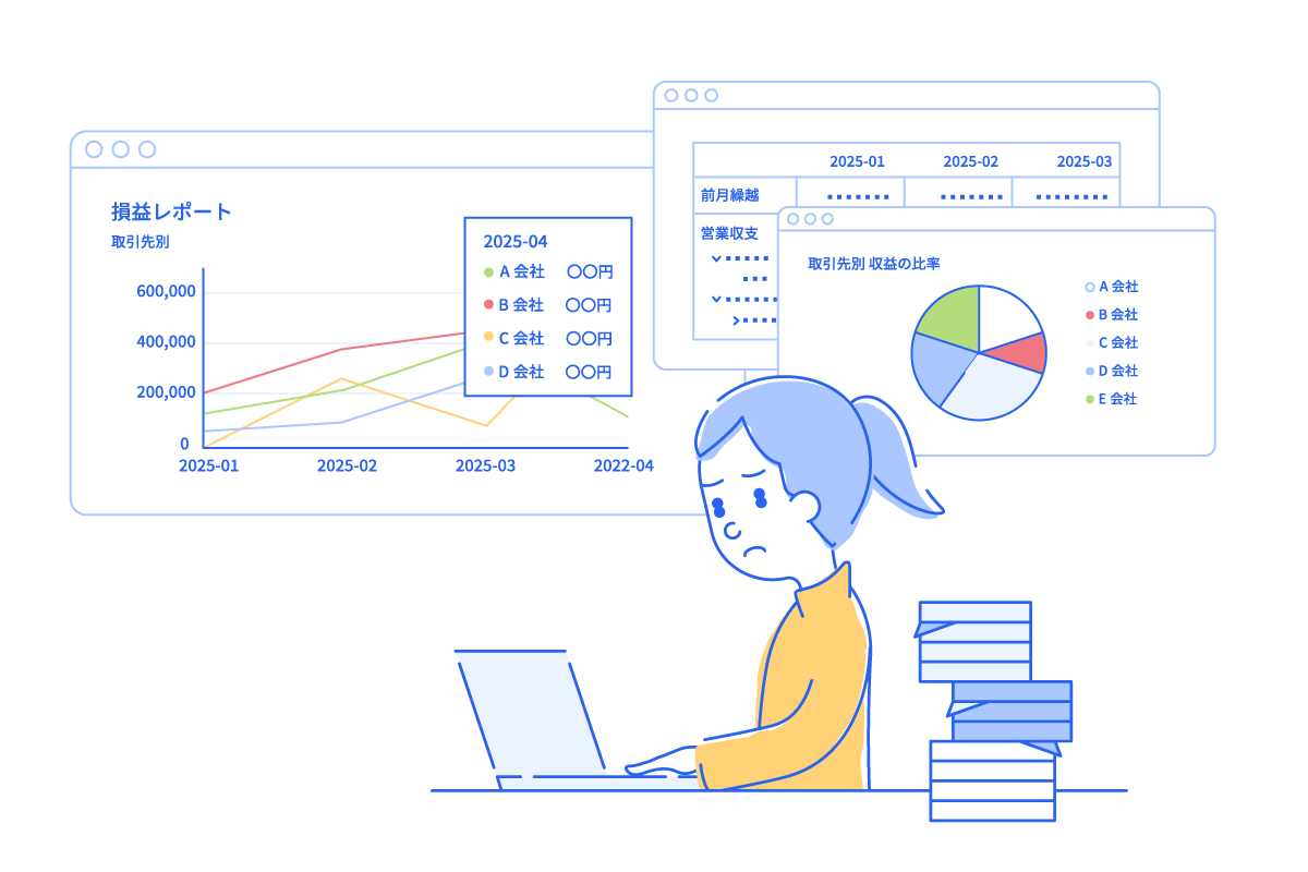 freee会計・マネーフォワードクラウド会計・PCA会計と連携し、単体会計情報を取得。