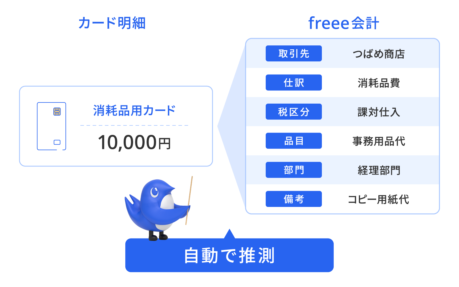 利用後、最短数秒でfreee会計に明細取り込み。毎月1日に明細が揃うので、月次決算がスピーディに!毎月の繰り返し利用を自動で仕訳します
