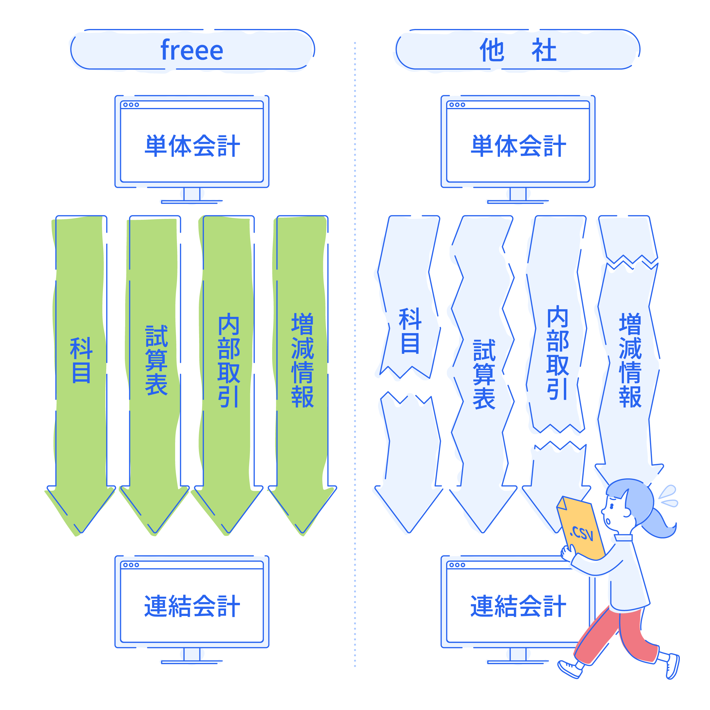 多くのソフトは、会計データをそのまま取り込むことができず、ソフト指定の形式(CSV)に加工・整形する作業が必要です。