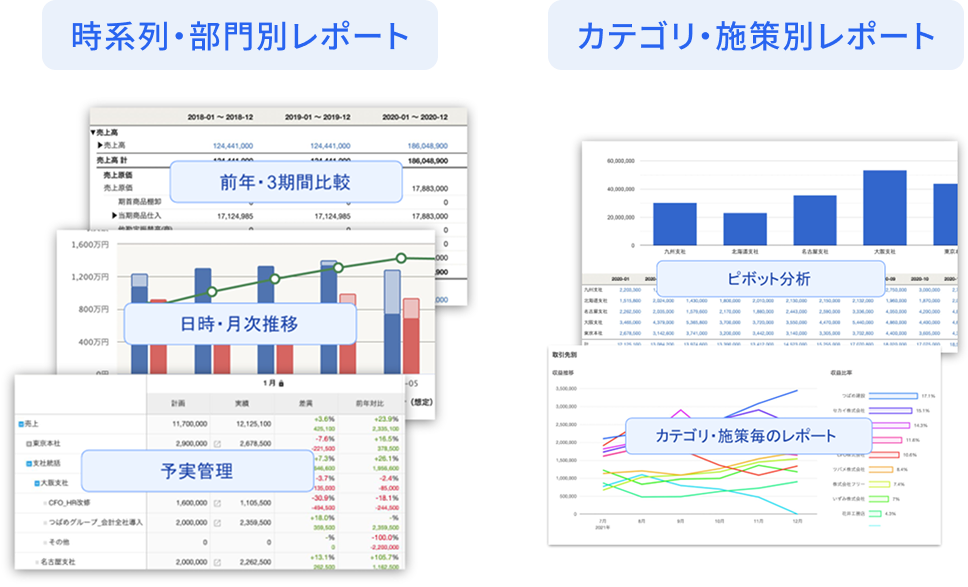 レポート作成⾏政報告に必要な特殊な帳票や部⾨別B/Sなどを⼿間なく作成。