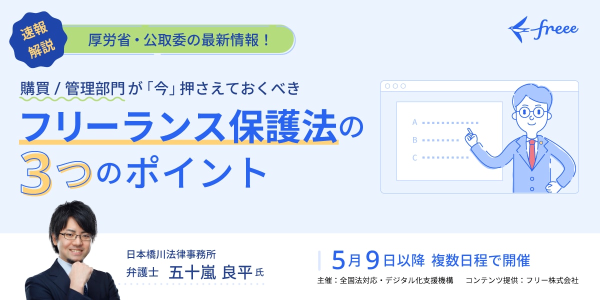 フリーランス・業務委託の方と働く法人企業様向けに、弁護士の方にご登壇いただき最新情報も交えてフリーランス保護法の解説を行います。